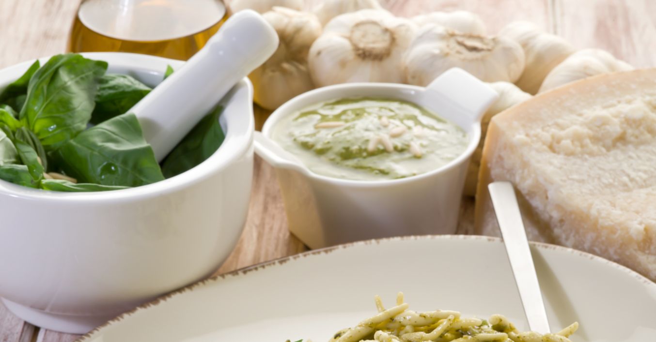 Se încinge untul și se pun pastele. Se adaugă o lingură de busuioc tocat și usturoiul pisat. Se presară sare și piper după gust și se amestecă ușor.