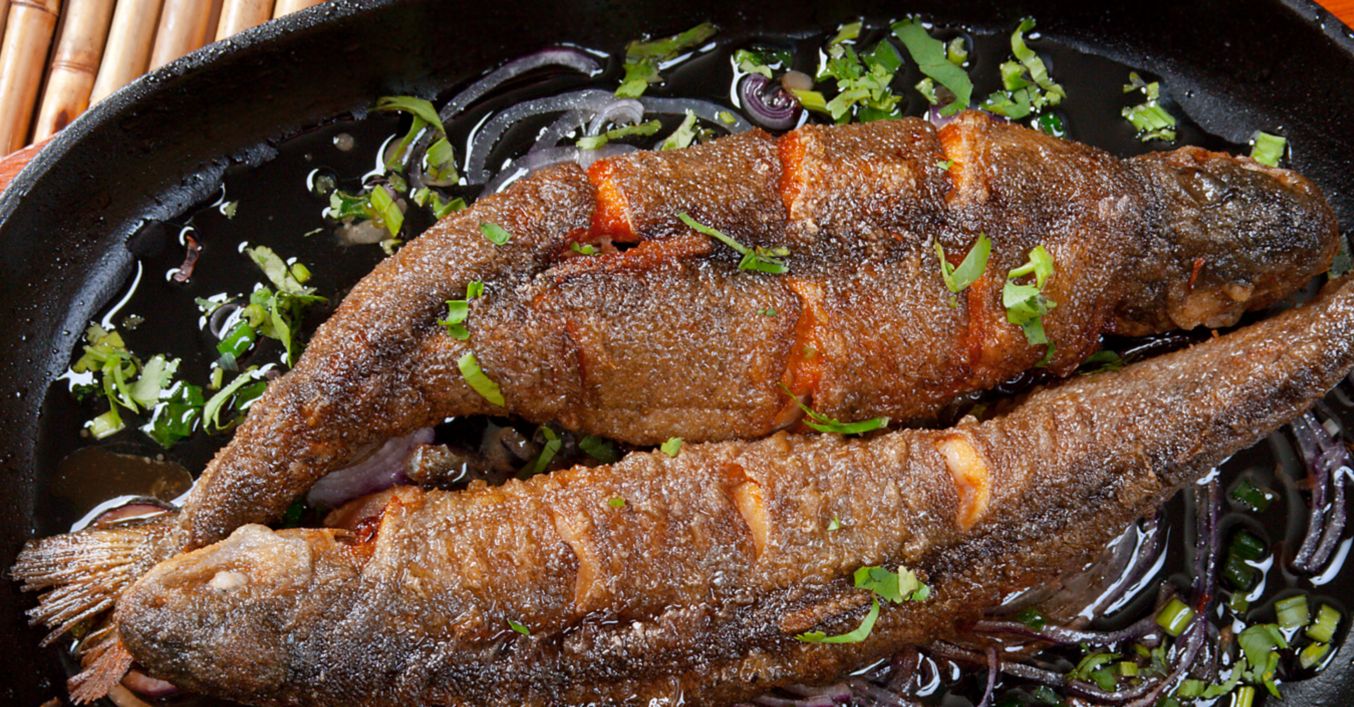 Se curăță bine peștii. Se spală și se tamponează cu un șervet. Se ung cu ulei și se presară cu sare, piper și boia iute, atât pe exterior, cât și în interior.