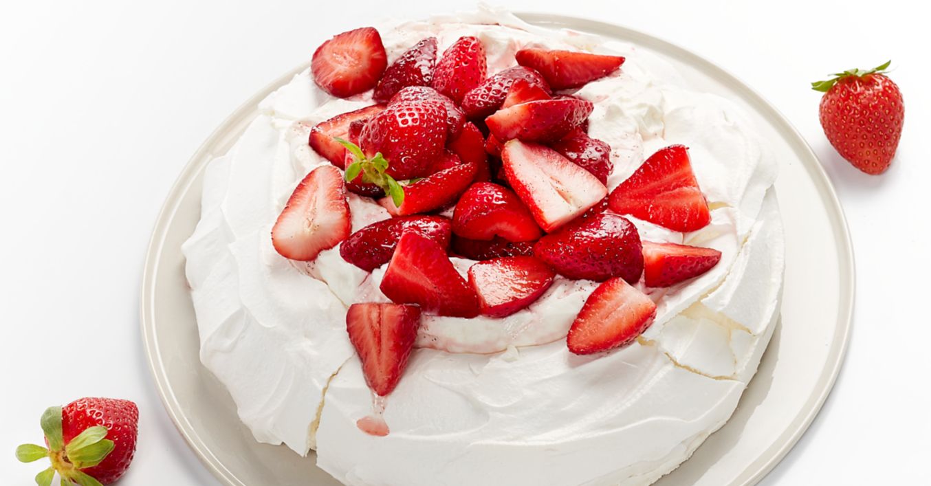 Bate frișca lichidă și încorporeaz-o cu brânză proaspătă. Toarnă compoziția în adâncitura din centrul Pavlovei, adaugă căpșunile marinate și presară zahăr pudră.