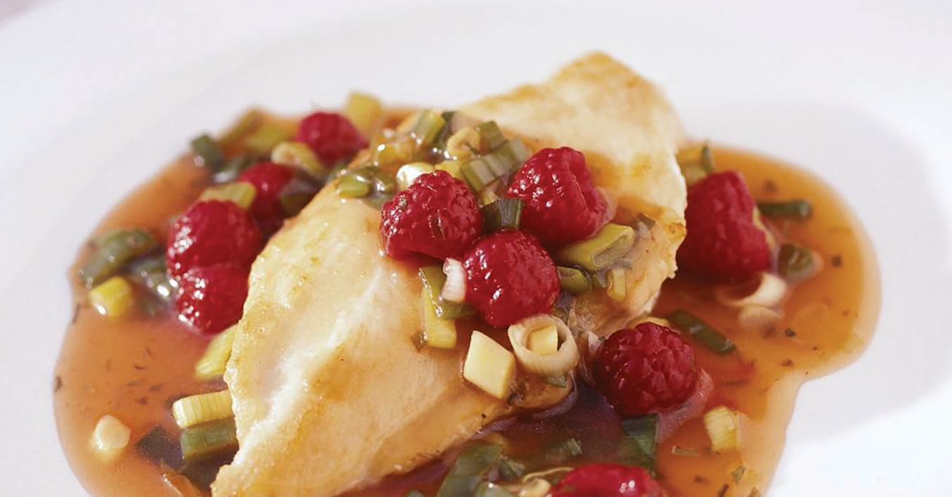 Se adaugă zmeura, apoi se toarnă sosul peste pui și se servește.