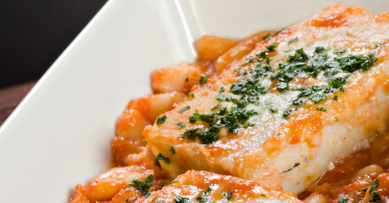 Acest amestec se pune într-o tavă întinsă. Se spală bine peștele și se pune pe patul de legume. Se tornă vinul și se coace 45 minute în cuptor, la foc moderat.