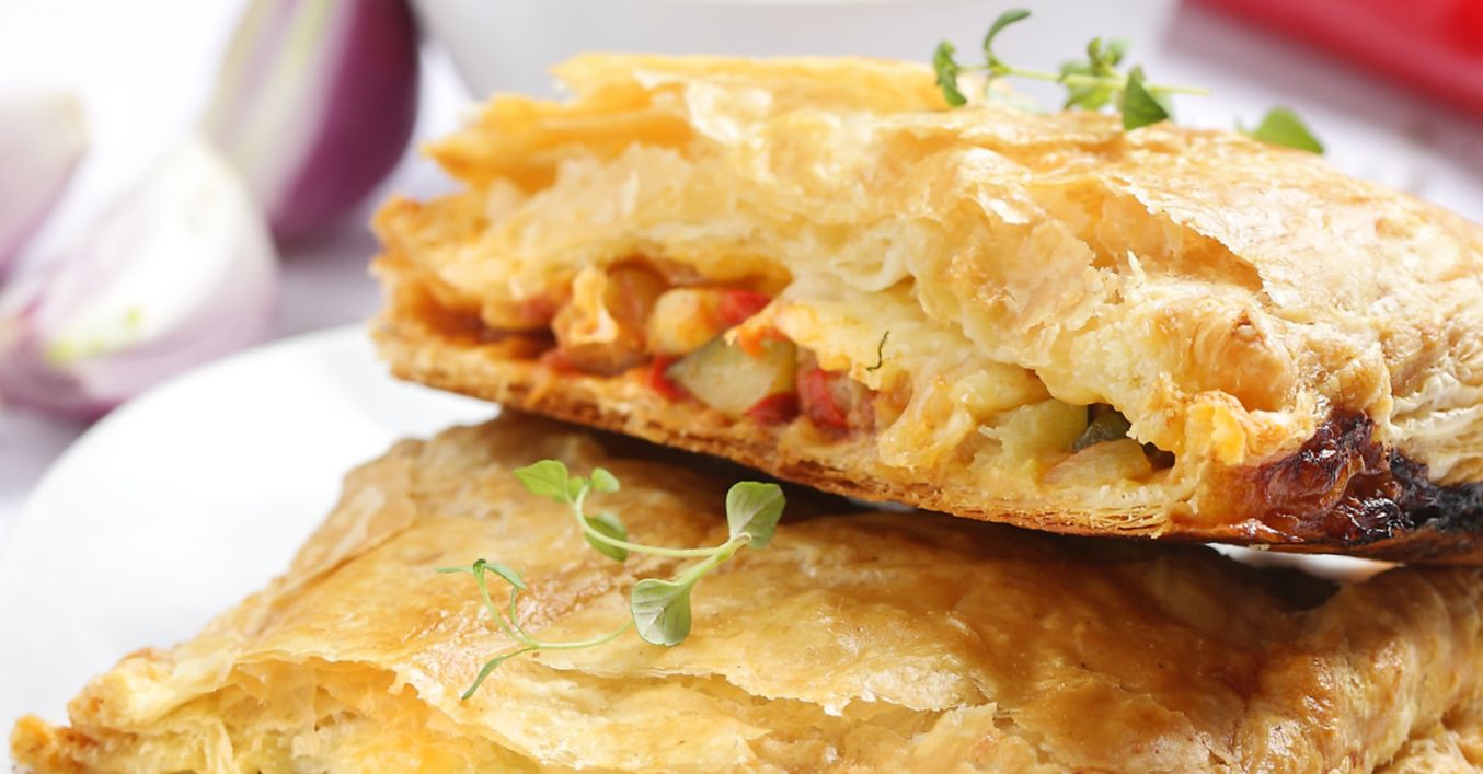 Se pregătesc foile de plăcintă. Se unge fiecare foaie cu unt topit. Se pun 3 foi una peste alta. Se întinde umplutura și se acoperă cu alte 3 foi.