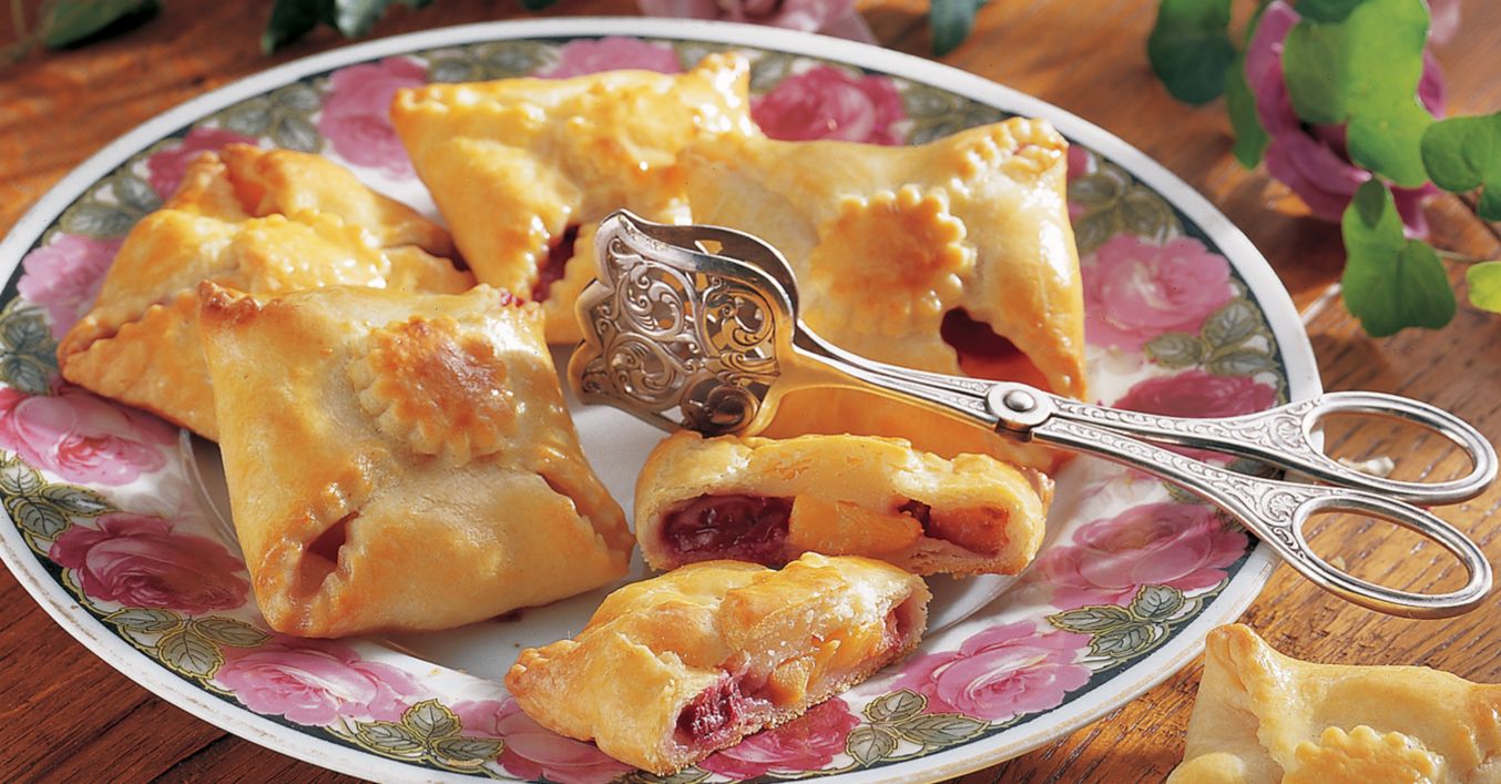 Se îndoaie cele 4 colțuri ale fiecărui pătrat spre centru. Deasupra vârfurilor se așază câte un cerculeț de aluat. Se bate gălbenușul cu frișcă și se ung pachețelele. Se așază pachețelele într-o tavă pentru cuptor și se coc 20 de minute în cuptorul încins.