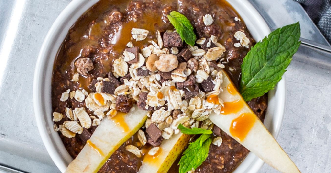 Terciul se toarnă în 2 castroane și se ornează cu pere, mentă și fulgii de ciocolată. Deasupra se picură sosul de caramel.