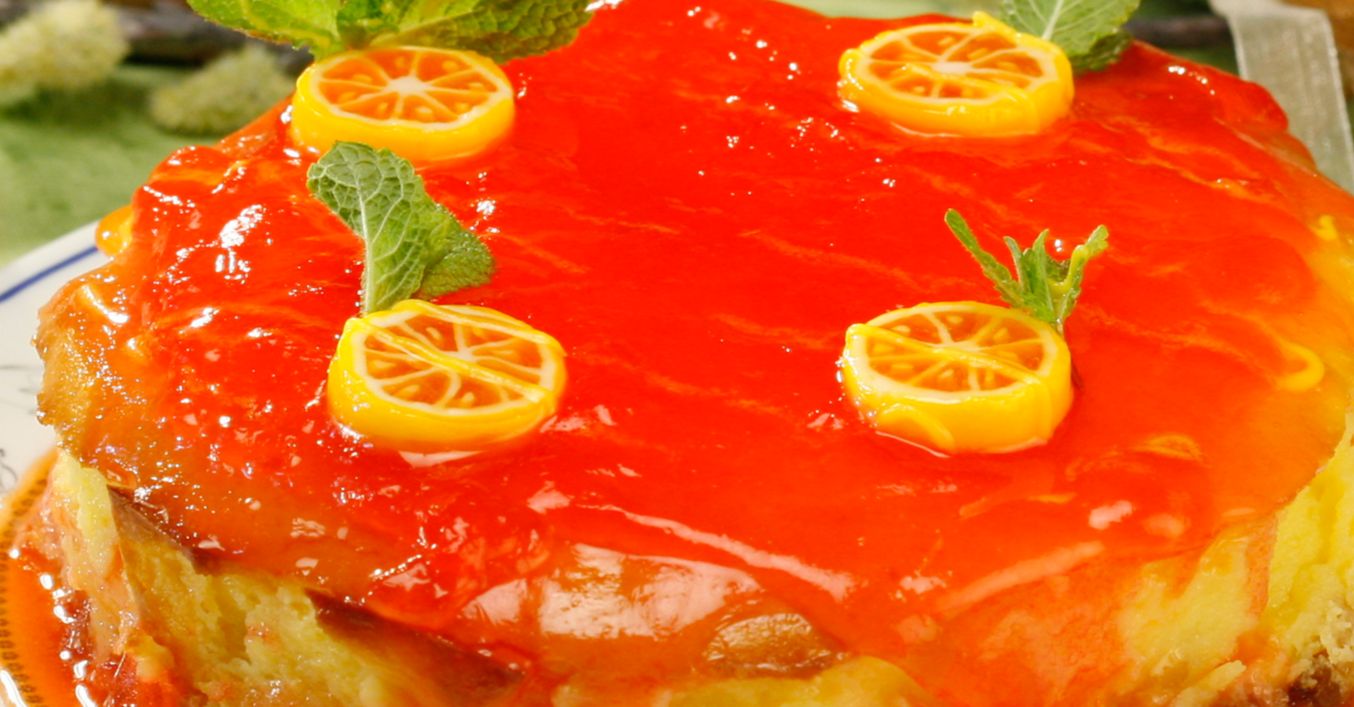 Cu 1 oră înainte de a aduce la masă prăjitura, o decorezi cu rondele de citrice decojite. Încălzești marmelada și ungi pasca și fructele cu un strat fin de marmeladă.