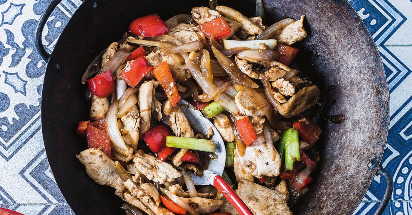 Se încinge wok-ul la foc puternic și se călesc bucățile de pui în stil stir-fry pînă sunt bine pătrunse. Se scot pe o farfurie și se mențin calde.
