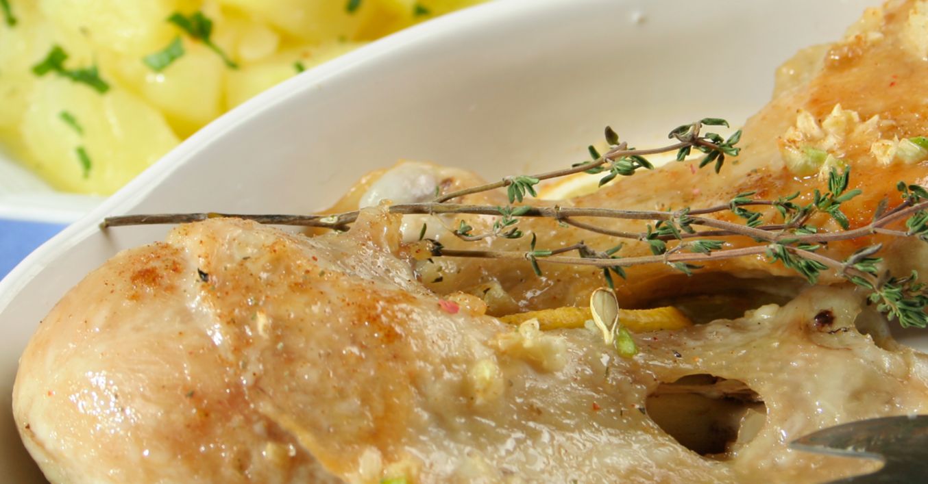 Scoți vasul din cuptor stropești carnea cu sosul format în tavă, apoi cu mujdeiul. Le dai din nou la cuptor până se rumenesc, micșorând intensitatea focului. Din când în când scoți vasul și stropești pulpițele cu sos.