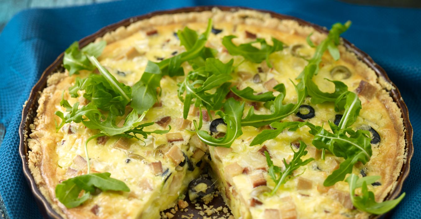 Tofu și camembert se taie cubulețe. Ceapa verde se curăță, se spală și se taie inele, iar măslinele se taie rondele. Ouăle se amestecă cu smântâna dulce și amidon și se condimentează cu sare și piper. Aluatul se întinde la o grosime de cca 5 milimetri și se aşază într-o formă de tartă unsă cu grăsime (diametrul cca 26 de centimetri) și se pre-coace în cuptorul preîncălzit la 180 de grade (convecție: 160 de grade) timp de cca 10 minute.
