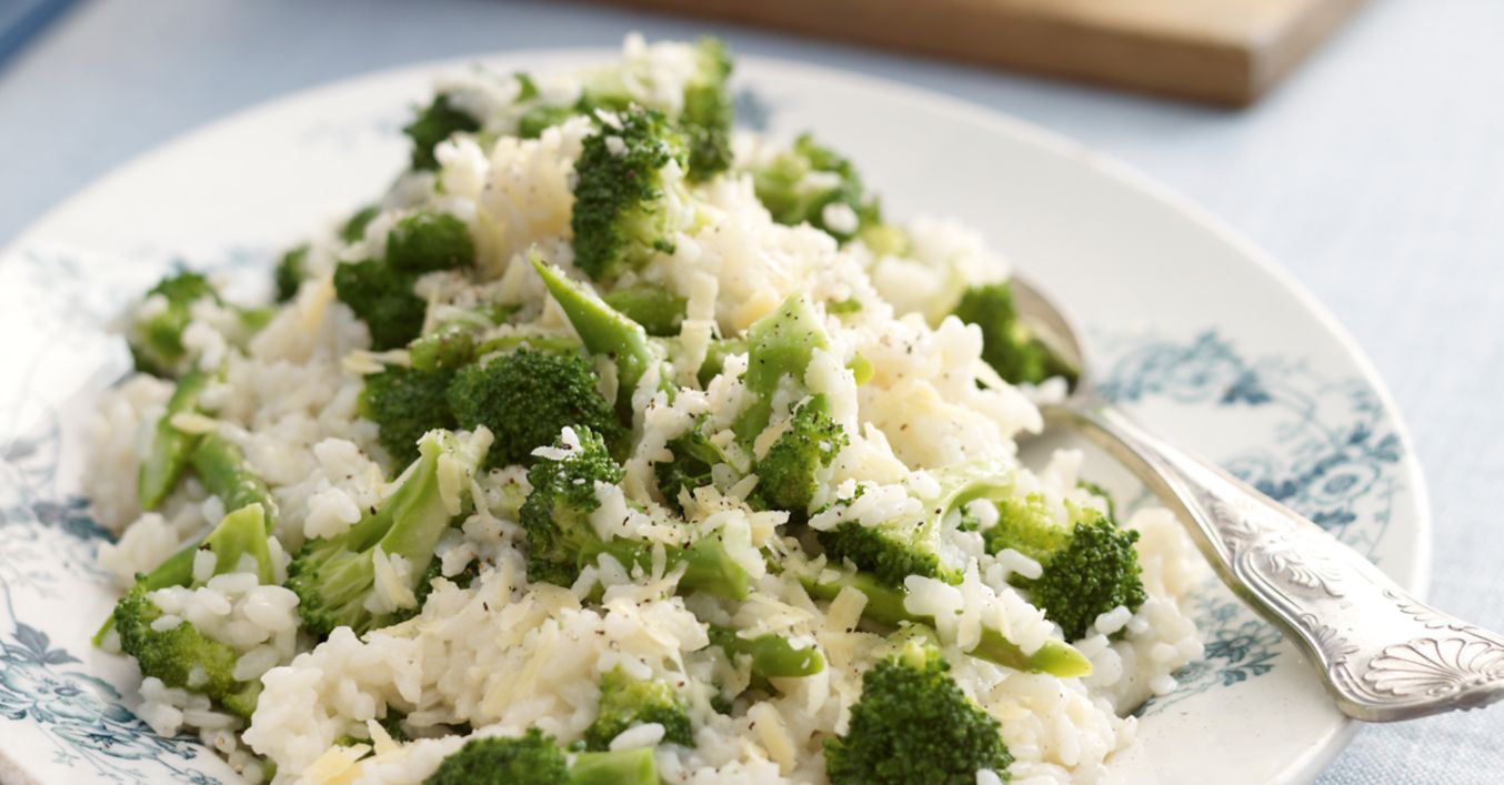 Adaugă buchețelele de broccoli și sparanghelul la orez. Mărește flacăra la mediu și gătește toate legumele, acoperit, timp de 4-5 minute (orezul trebuie să fie moale).
