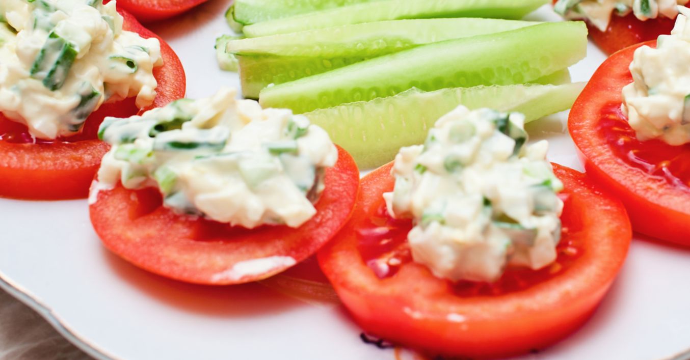 Se taie roșiile rondele și se pun pe platou. Pe fiecare rondea de roșie se pune crema cu ouă.