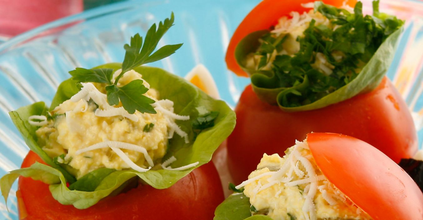 Fierbi ouăle tari, apoi le cureți. Speli roșiile și le tai câte un căpăcel la partea dinspre codiță. Cu ajutorul unei lingurițe, scoți o parte din miez, pe care îl poți folosi la sosul unei fripturi sau la un alt preparat. Presari interiorul roșiilor cu sare și le lași să se scurgă cu gura în jos.