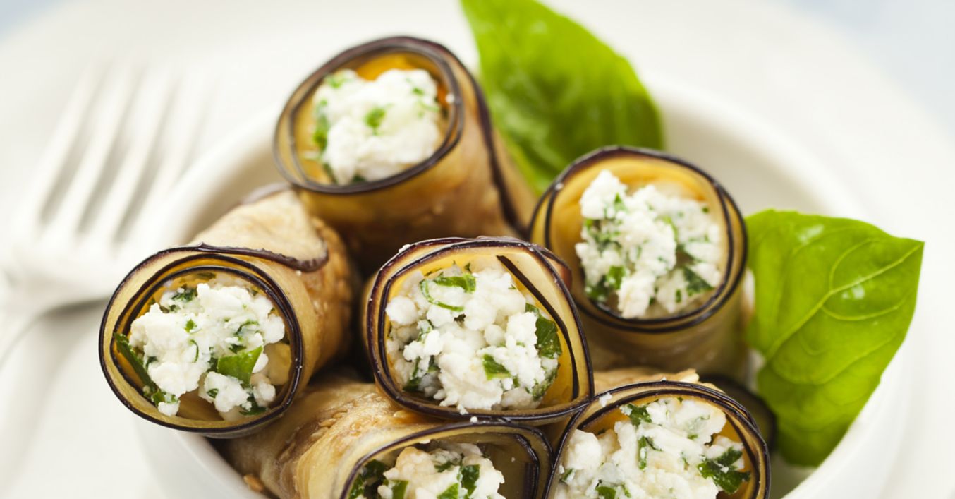 Dovlecelul şi vânăta se curăță, se spală şi se taie felii subţiri, pe lung. Pe grătarul încins se frig feliile de dovlecel şi de vânătă. Se scot şi se lasă să se răcească. Între timp, se pregăteşte umplutura. Brânza de vaci se omogenizează cu brânza mascarpone și cu cele 2 gălbenușuri. Se presară și usturoiul tocat mărunt și uleiul de măsline şi se condimentează cu sare şi piper. Feliile de dovlecel şi de vânătă se ung cu un strat subţire de cremă, se pun câte 3-4 feliuţe de măsline, apoi se rulează şi se servesc calde sau reci.