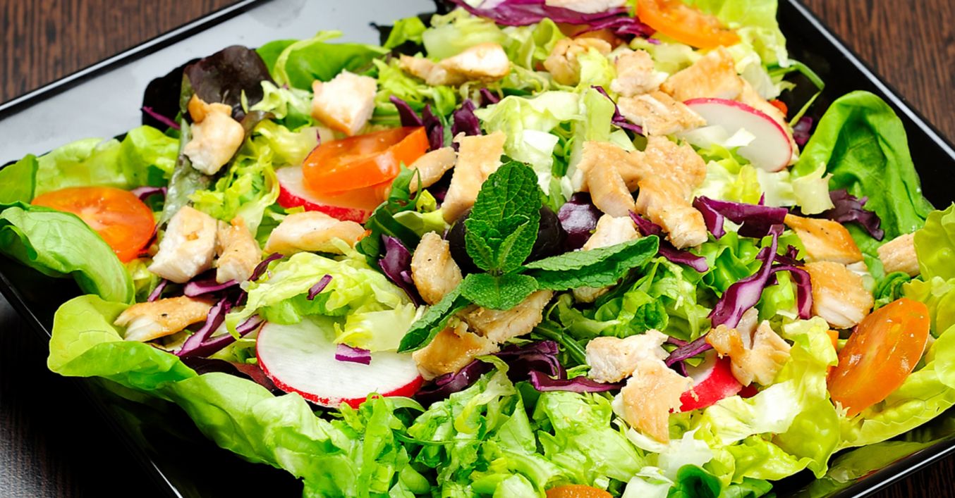 Salată asortată cu varză roșie, pui și ridichi