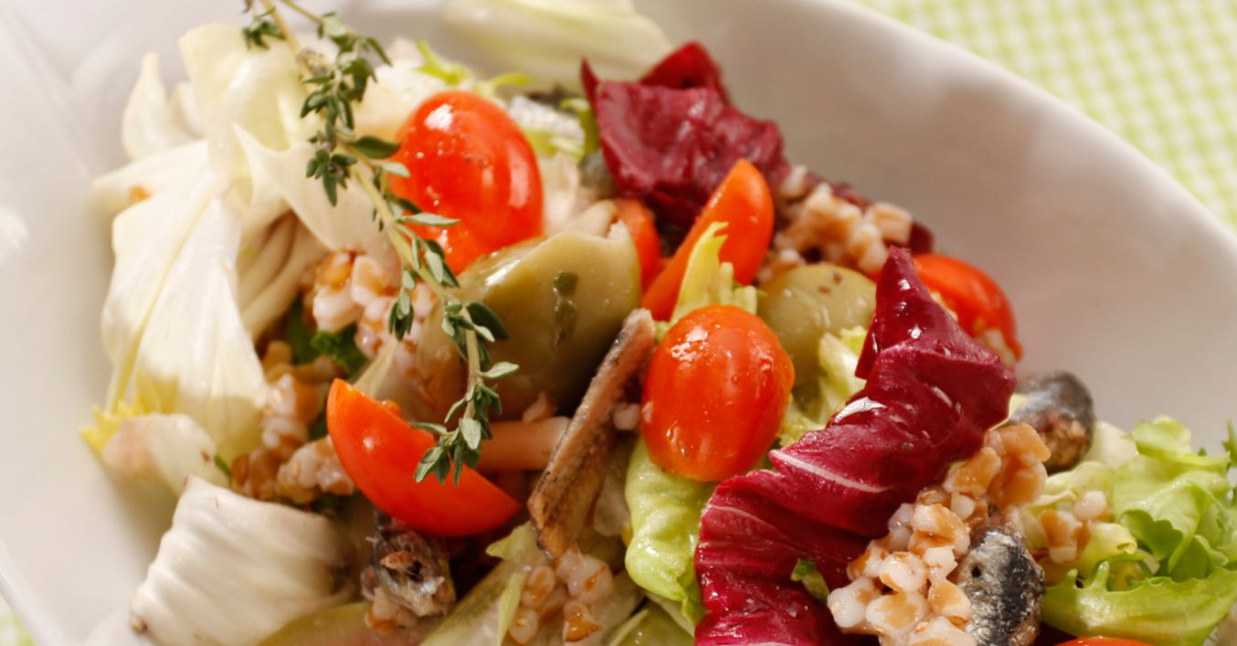 Speli salata frunză cu frunză, după care o tai fideluță. Speli roșiile și le tai în jumătăți. Cureți ceapa și o tai julien. Poți folosi măslinele fie întregi, fie tăiate în fâșii. Tai în fâșii radicchio.