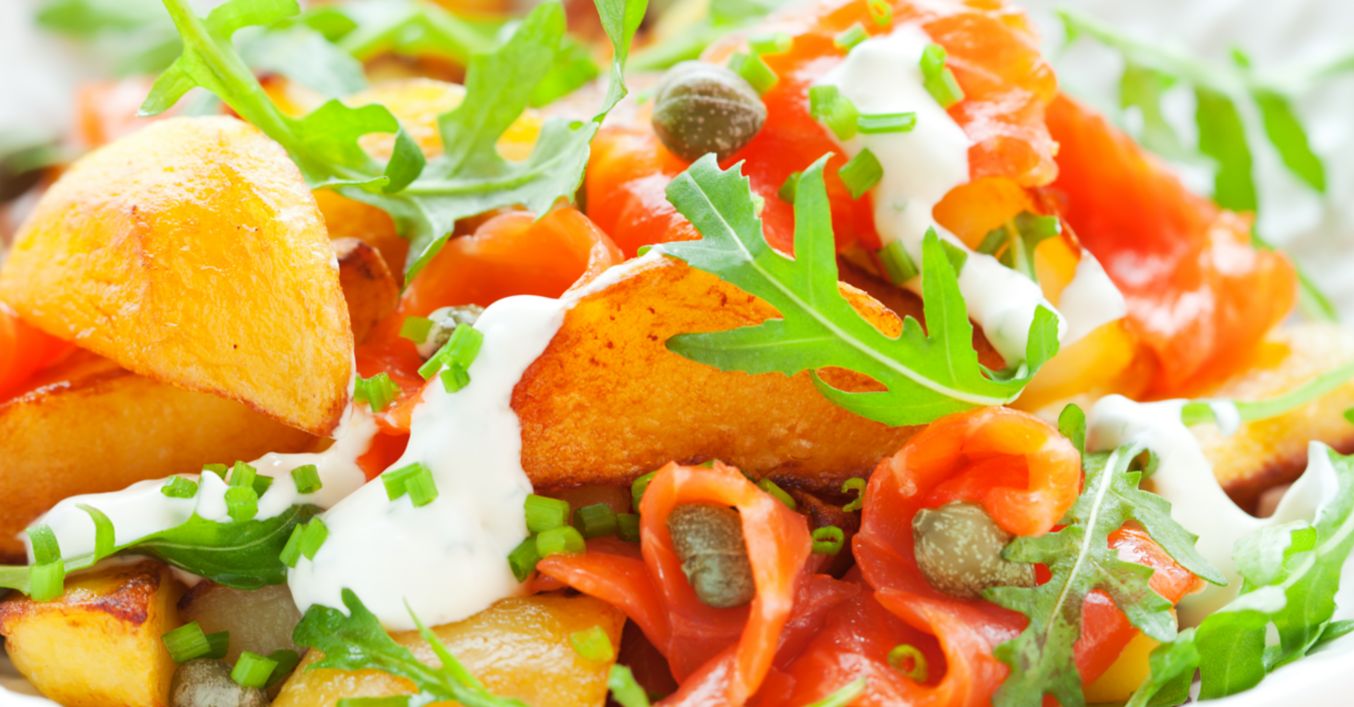 Se pun într-un bol, se adaugă fâșii de somon-fume, brânza, caperele și frunzele de rucola.