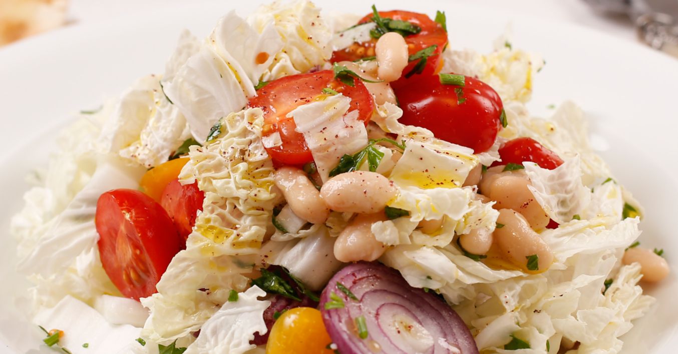 Amesteci într-un bol varza, roșiile, năutul, ceapa, bucățile de lipie și pătrunjelul.