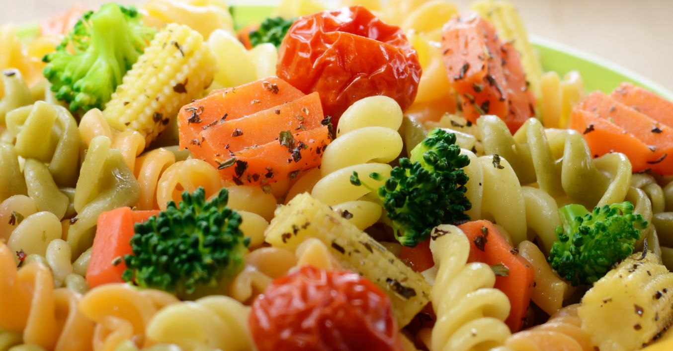 Separat, se fierb pastele în multă apă cu sare. Se scurg de apă şi se pun într-un bol. Se pun peste ele legumele prăjite,împreună cu tot sosul pe care l-au lăsat în farfurie. Se adaugă sare şi se amestecă totul. Se lasă la răcit complet.