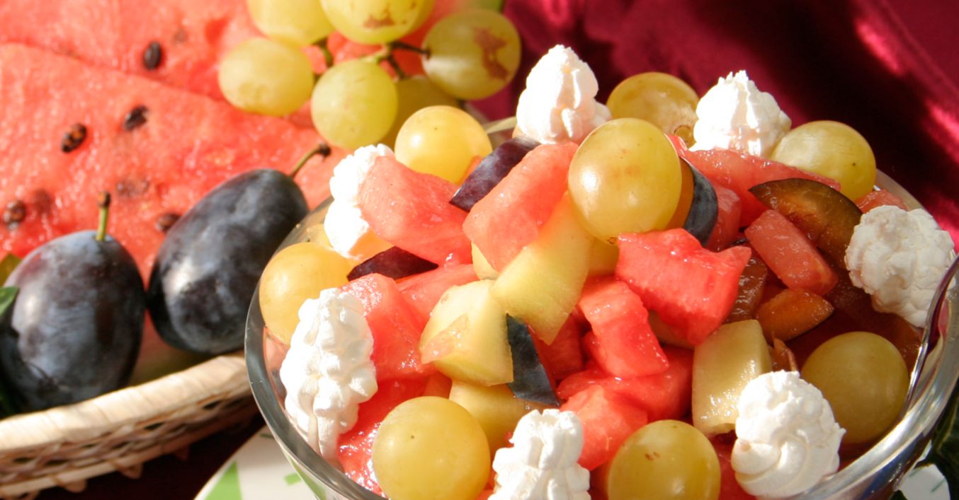 Alegi fructe bine coapte. Cureți de coajă și semințe pepenii și îi tai în cuburi. Speli strugurii, desprinzi boabele de pe ciorchine și le lași să se scurgă. Speli prunele, le opărești timp de 2 minute și le cureți de coajă, apoi le scoți sâmburii și le tai în sferturi.