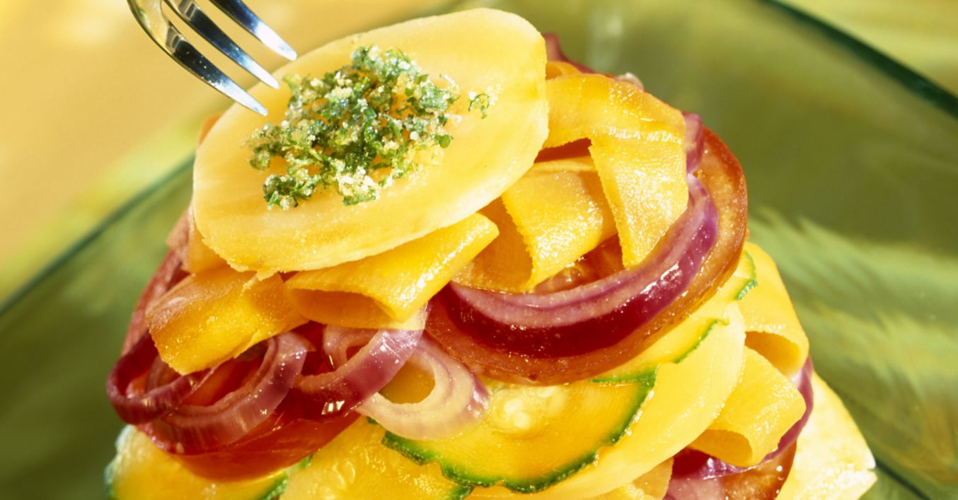 Se curăță piersicile și legumele și se taie rondele subțiri.