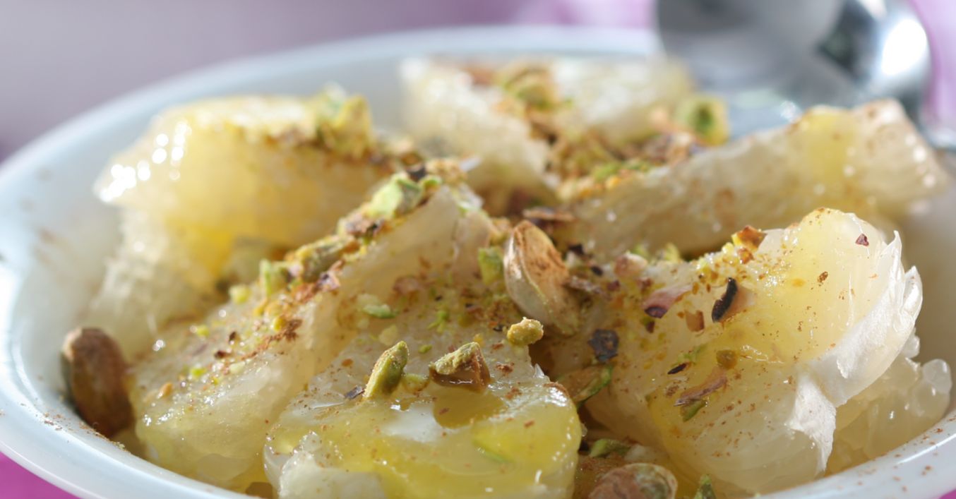 Decojești fisticul și îl toci. Amesteci într-un castron cuburile de pomelo cu fisticul, semințele de floarea-soarelui, coaja rasă de lămâie, mierea și scorțișoara.