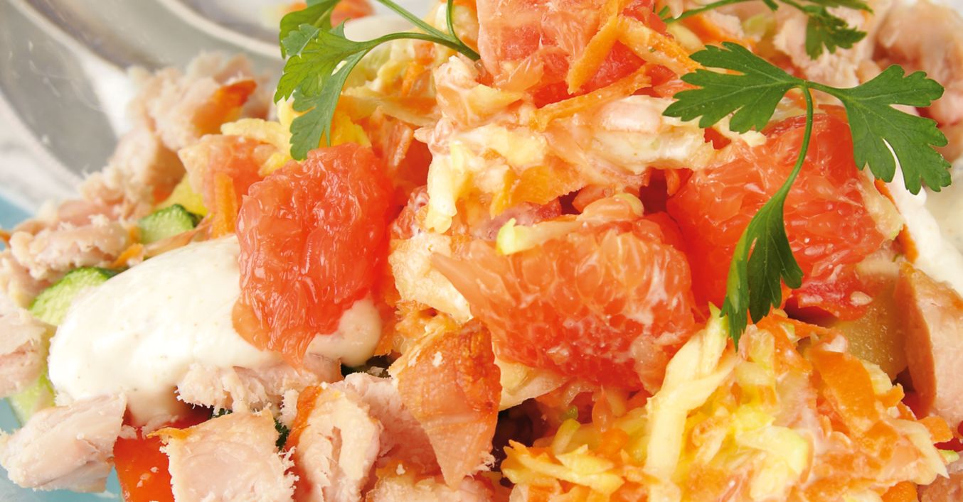 Decojești grepfruturile și cureți fiecare felie de pielița albă, amară, după care le tai în bucăți mici. Cureți, speli și dai pe răzătoarea mare morcovii și dovleceii. Le stropești cu zeama de lămâie, ca să nu oxideze.