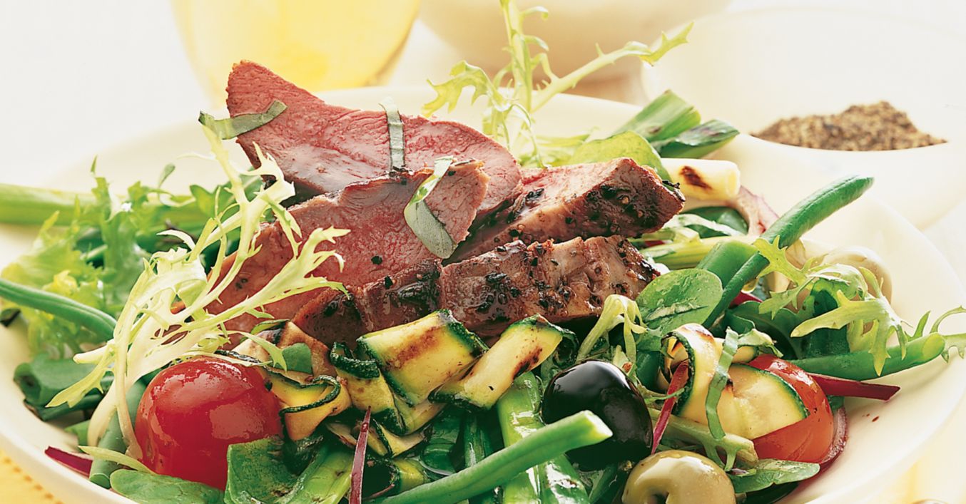 Se așază pe foc un grătar de fontă, să se încingă. Între timp, se opărește fasolea 2 minute, se scurge și se răcorește sub jet de apă. Se pun într-un castron păstăile, tăiate în jumătate, cu frunzele de salată, busuiocul tăiat fâșiuțe subțiri, ceapa roșie feliată subțire și măslinele; se amestecă.