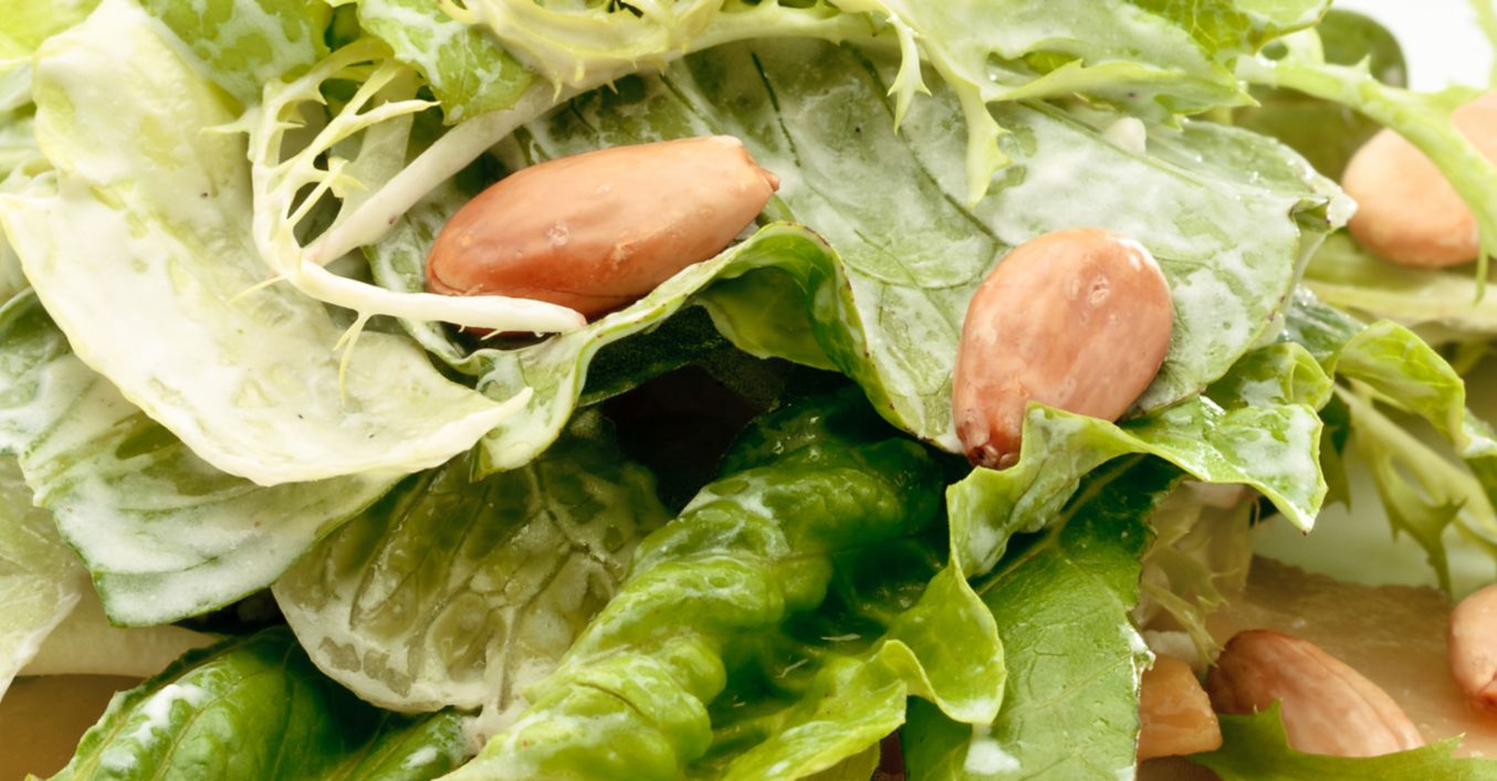 Se pun pe un platou fâșii subțiri de pepene galben. Se adaugă frunze de rucola. Se presară migdale și cubulețe de brânză.