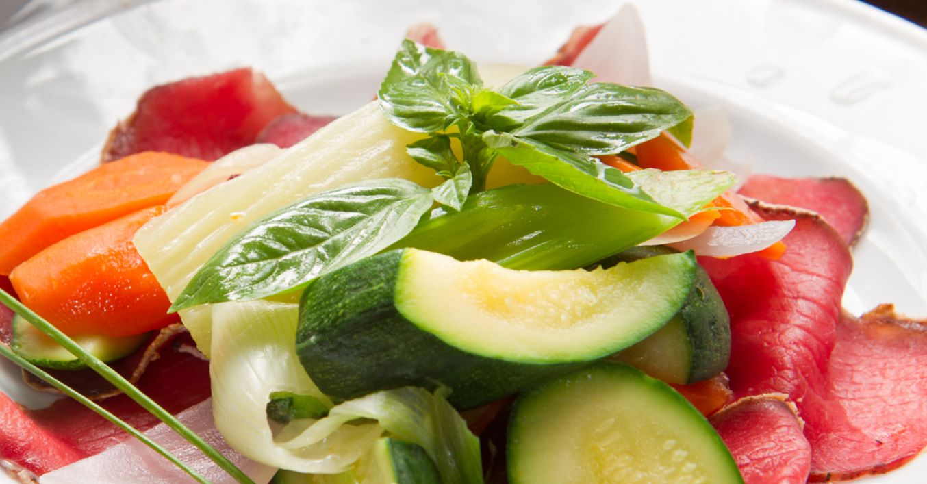 Se montează farfuriile. Se pune un pat din fâșii de mușchiuleț afumat. Se adaugă legumele și se presară sare. Se stropește totul cu puțin ulei de măsline și suc de lămâie.