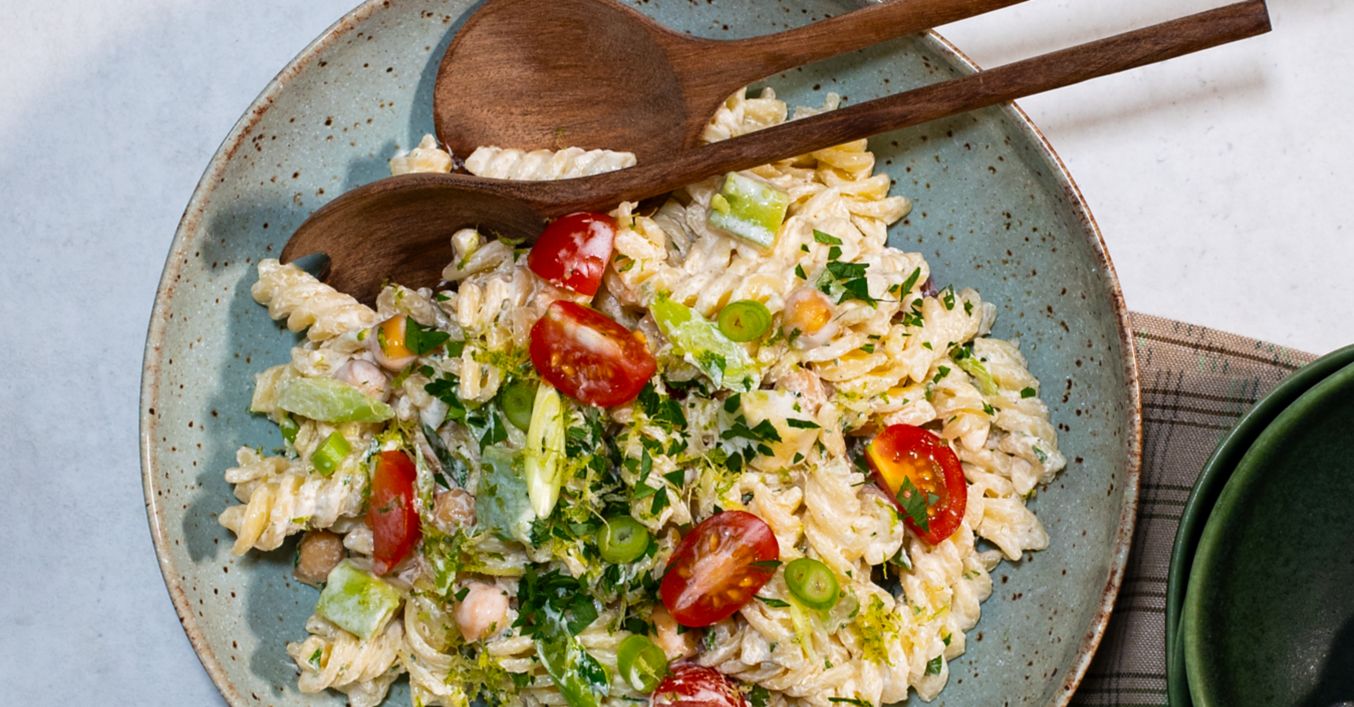Pentru dressing, amestecă smântâna acră împreună cu oțetul, ierburile aromatice, mierea și muștarul și condimentează cu sare și piper. Amestecă dressingul cu ingredientele pentru salată și cu tăițeii.