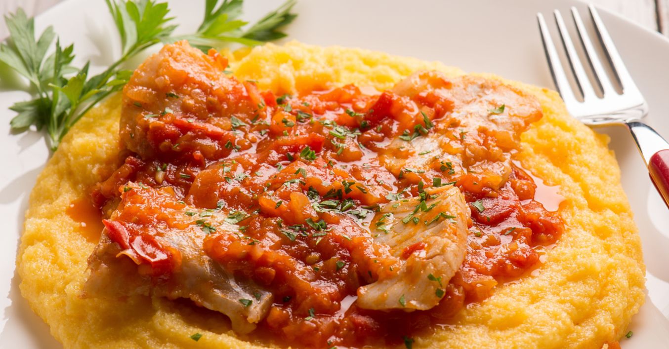 Se pregăteşte o mămăligă şi se serveşte cu saramura de peşte cu roșii și ardei copți, caldă.