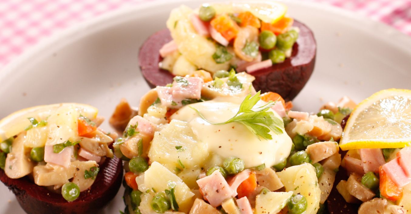 Umpli sfecla cu acest amestec și decorezi cu rondelele de lămâie.