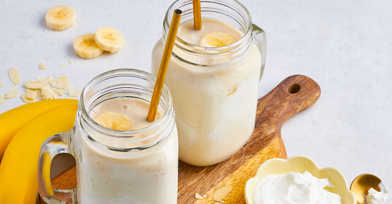 Clătiți lămâia cu apă fierbinte, tăiați-o, răzuiți fin 1 linguriță de coaja și stoarceți sucul. Amestecați cu lapte, suc de lămâie, mere, banane, 2 linguri de migdale și sirop de arțar până când shake-ul are o consistență uniformă, cremoasă.