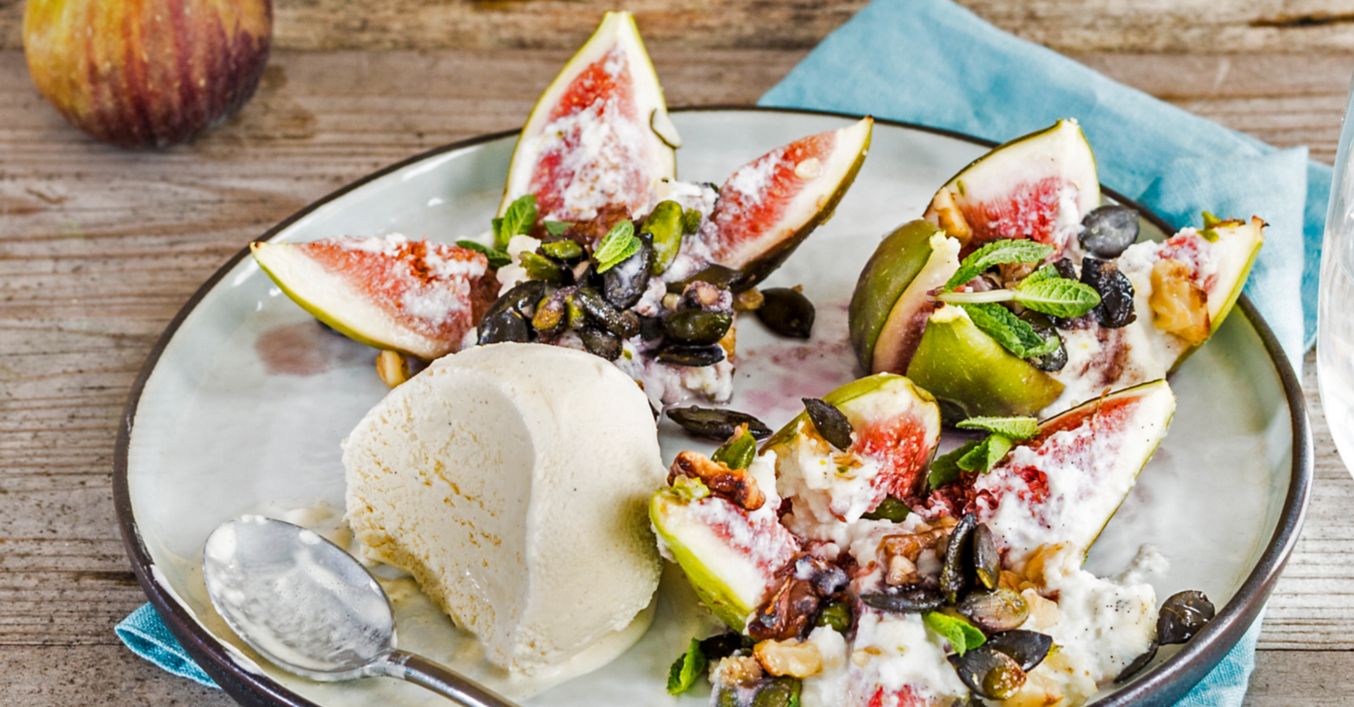 Alunele, fisticul și semințele de dovleac se taie mare și se presară deasupra smochinelor. Mierea se picură pe smochine.