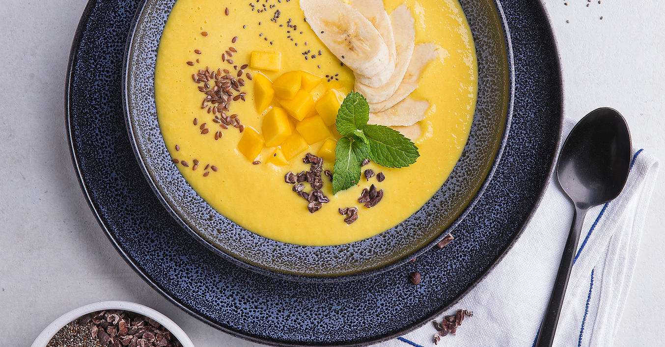 Curăță banana rămasă și taie-le în felii subțiri. Se ornează vasul pentru smoothie cu cuburi de mango, felii de banană, semințe de chia, semințe de în și sâmburi de cacao. Ornează cu câteva frunze de mentă.