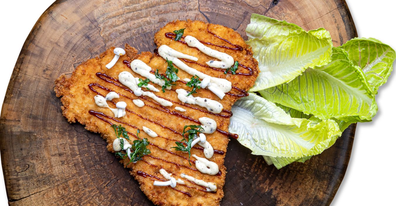 Alături de șnițel se pot adăuga câteva frunze de salată când sunt gata, iar totul se așează pe un fund de lemn și se asezonează cu tarhon și maioneză după gust.