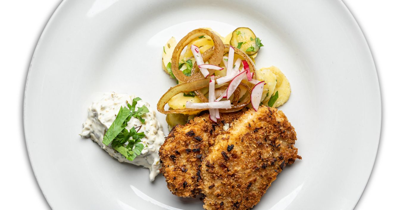 Se scoate carnea din frigider de preferat cu o seară înainte de a fi preparată și se bate cu ciocanul de șnițele, pentru a fi cat mai fragedă și mai subțire.Bucățile de carne se presară cu sare, piper și tarhon după gust, iar apoi se lasă la frigider pentru aproximativ 20 de minute. Într-un bol se amesteca făina cu piperul, tarhonul și sarea. În alt bol se bat bine ouăle iar in al treilea bol se pune pesmetul.Cotletele de porc gata porționate se trec prin parmezan apoi prin ou iar la final prin pesmet și se prăjesc în uleiul bine încins pe ambele parți până se rumenesc frumos. Când sunt gata, se scot pe un șervet absorbant din hârtie.Între timp, cartofii albi se lasă la fiert, după care se crestează în bucăți cât mai mici și se asezonează cu unt, sare, piper și pătrunjelul proaspăt și se introduc la cuptorul în prealabil încins pentru aproximativ 20 de minute. Înainte sa fie scoși cartofii din cuptor, se adaugă parmezanul și se mai lasă în cuptor pentru înca 5 minute.Snițelul de porc se servește cu garnitură și salată peste care se adaugă frunze de pătrunjel proaspăt.Alături de șnițel se pot adăuga câteva frunze de salată când sunt gata, iar totul se așează intr-o farfurie adâncă și se asezonează cu tarhon și maioneză după gust.