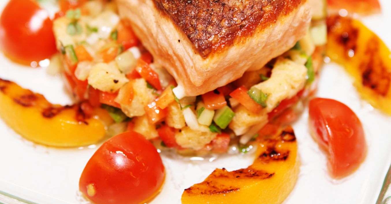 Se pune somonul peste grămăjoara de legume și se ornează cu felii roșie și piersică.