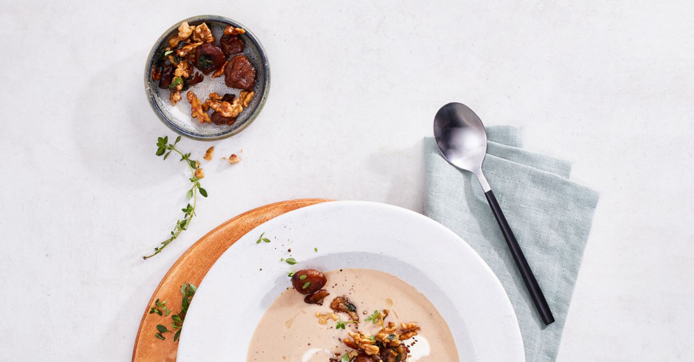 Se adaugă smântâna și oțetul în supă și se pasează fin cu ajutorul unui mixer vertical. Se asezonează cu sare, zahăr și piper și se fierb puțin. Se spală cimbrul, se usucă și se îndepărtează frunzele de pe tulpini. Se pune supa în farfurii, se adaugă câte o lingură de crème fraîche și se presară amestecul de castane și nuci. Se servește cu cimbru.