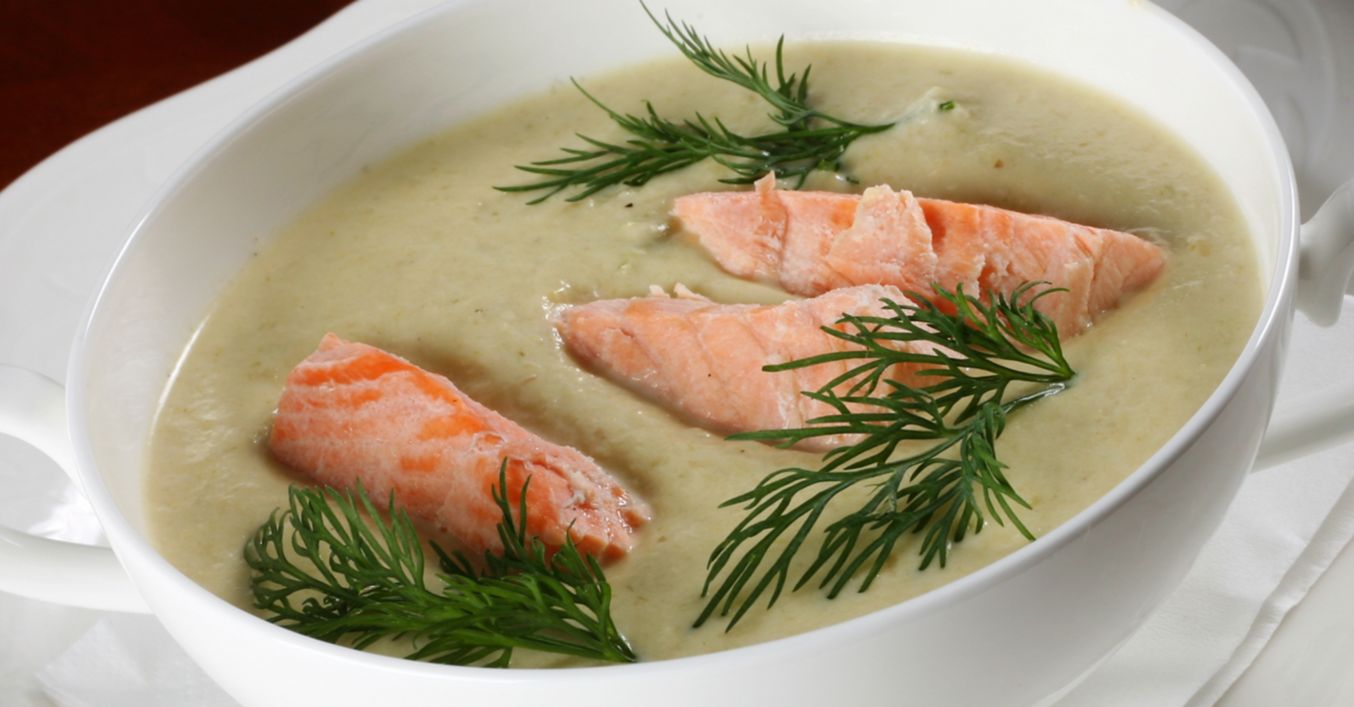 Se pune supă cremă în boluri, se adaugă bucățele de somon pregătit pe grătar și se ornează cu mărar proaspăt.