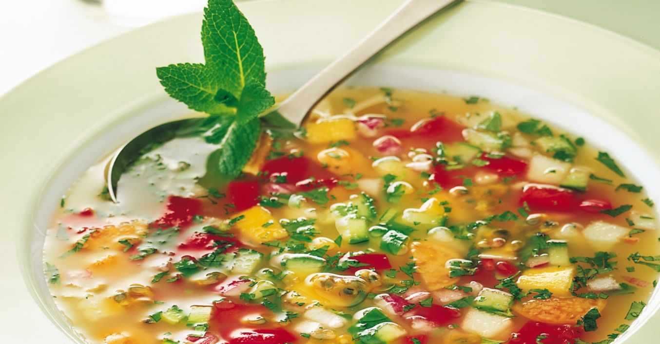 Se curăță mango, se scoate sâmburele, se taie cubulețe și se pune în supă. Se aruncă pielițele ca hârtia de la physalis și se taie în patru. Se scoate miezul perei, se taie cubulețe și se pun în supă împreună cu physalis. Se taie fructul pasiunii în două, se scoate pulpa fructului cu o linguriță și se amestecă în supă cu menta și coriandrul tocate.