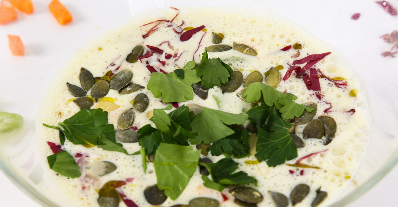La final, se decorează cu semințe de dovleac, pătrunjel tocat și câteva picături de ulei de măsline.