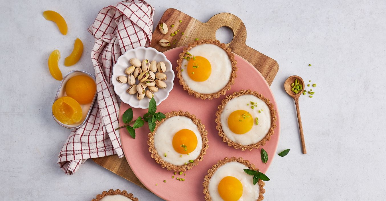 Scurge caisele și lasă-le la uscat. Întinde crema uniform peste tartele, adaugă caisa ca gălbenuș de ou și pune-le la frigider aproximativ o oră.