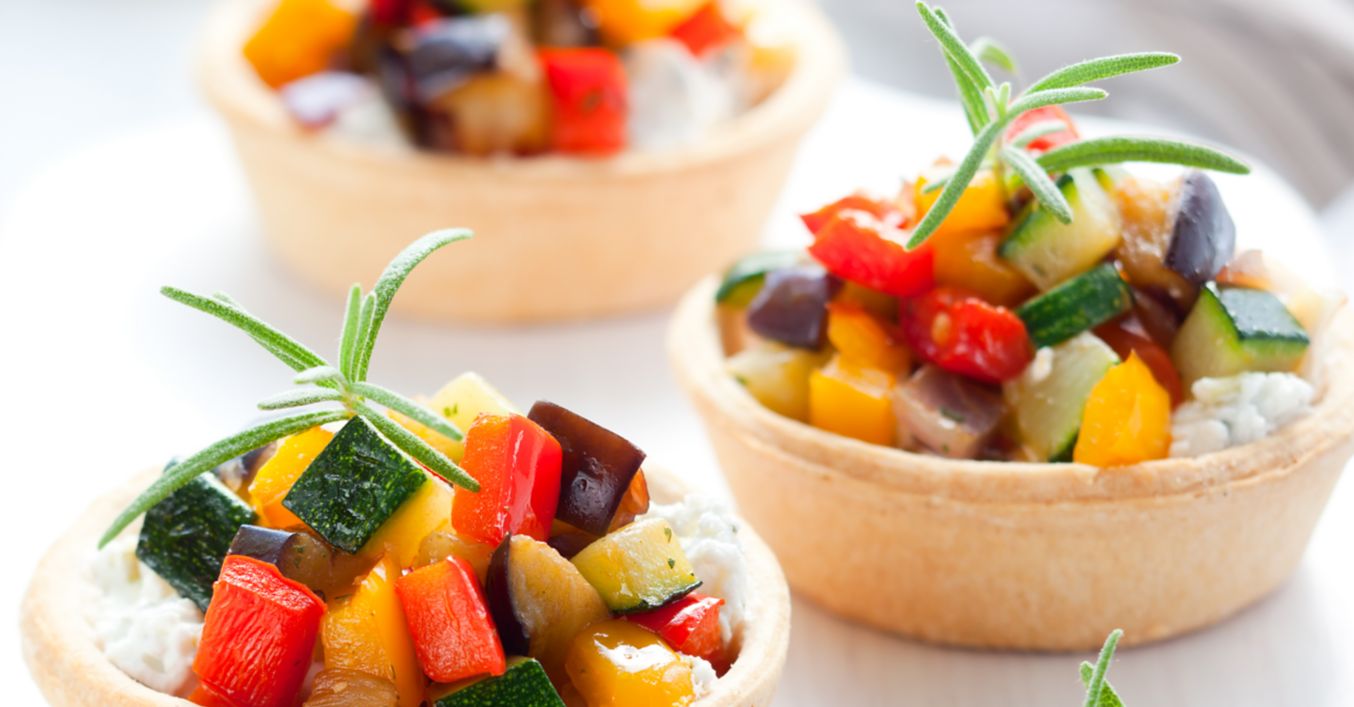 Se pune o bază din cremă de brânză în fiecare castronel. Se umplu cu amestecul de legume, se presară cu sare și se ornează cu crenguțe de rozmarin.