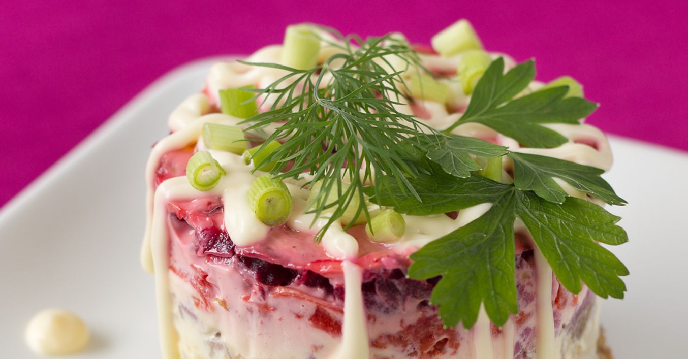 Se coace sfecla rosie în cuptor. Se decojește și se rade pe răzătoarea mare. Morcovii curățați se rad pe răzătoarea mică și se amestecă cu sfecla și o lingură de maioneză.
