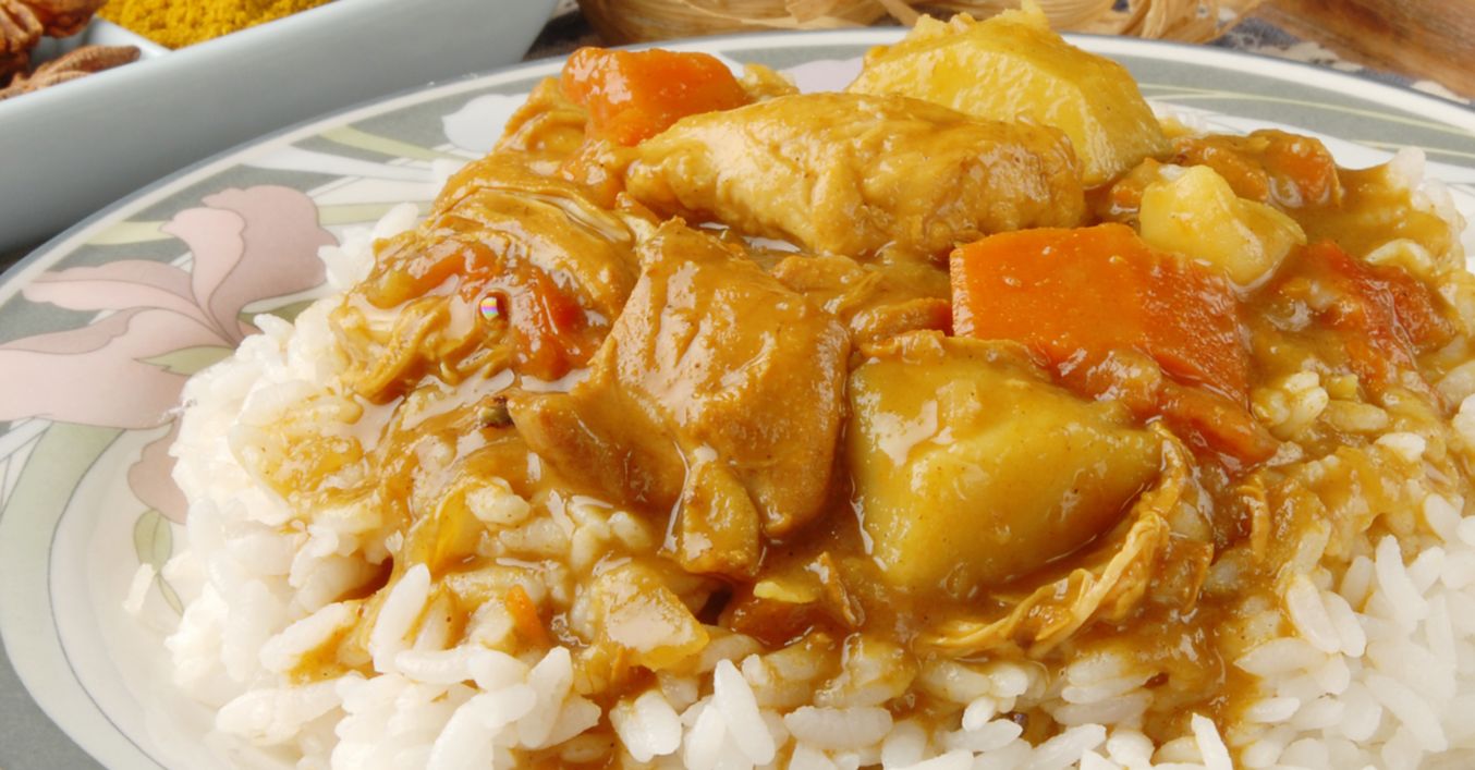 Se montează farfuriile. Se pune un pat de orez, care se acoperă cu mâncărica de pui.