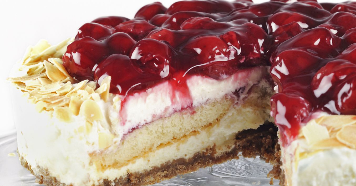 Se întinde pasta de caise pe un platou. Se pune deasupra jumătate din cantitatea de cremă și se așează pișcoturile. Se acoperă cu restul de cremă. Se nivelează și se presară fulgi de migdale. Se pun cireșele. Se prepară gelatina și se pune peste cireșe.