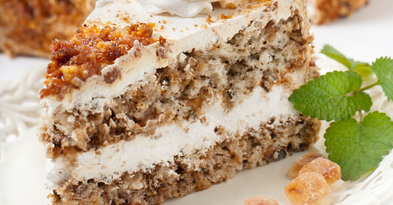 În frișca bine bătută se adaugă alunele de pădure caramelizate și mărunțite și se încorporează ușor.