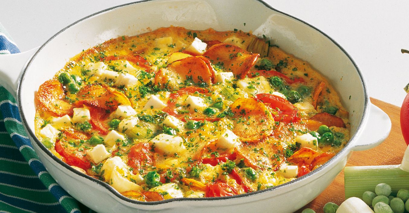 Se încinge uleiul într-o tigaie mare și se călesc cartofii, mazărea decongelată și prazul 10 minute, amestecând din când în când. Se adaugă jumătate din telemeaua tăiată cubulețe, se amestecă și se pun deasupra roșiile feliate și restul de telemea.