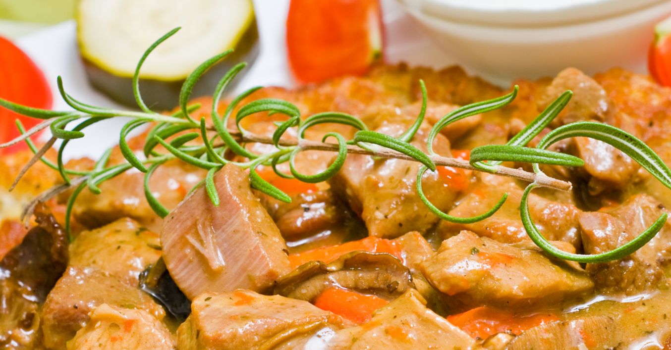 Se toacă ceapa mărunt. Se prăjește 1 minut în 4 linguri de ulei. Se adaugă carnea tăiată cubulețe, se amestecă bine și se toarnă supa. Se lasă 60 minute la fiert. Se adaugă morcovii tocați mărunt, sucul de roșii, sarea, piperul și cimbrul. Se lasă să mai fiarbă 45 minute.