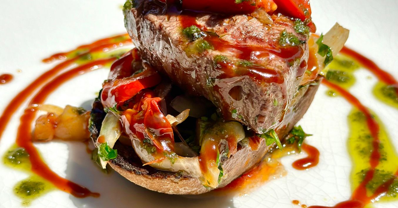 După ce legumele sunt gata, adăugam pe grătar carnea de vită și pâinea unsă cu ulei de măsline.